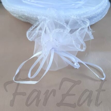 Saculeti organza albi pentru marturii de nunta sau botez ce au marginea brodata cu fir argintiu si se prind cu