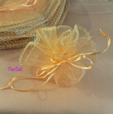 Marturie din organza aurie de forma rotunda cu diametrul de 26 cm, cu margine brodata cu fir  prinsa cu fundita