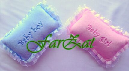 Marturii botez in forma de pernuta( baby boy/ baby girl )  cu margine de organza. Aceste marturii sunt mici atentii daruite
