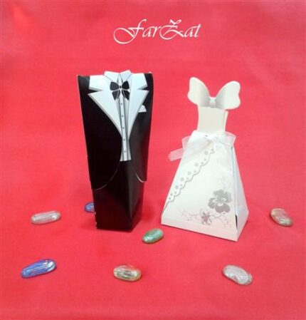 Cutiute marturii nunta model mire si mireasa realizate din carton. Cutiutele pot fi umplute cu pietre decorative sau bomboane. Caracteristici: