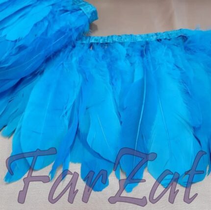 Banda decoartiva realizata din pene naturale (vopsite si tratate) cusute pe panglica satinata cu latimea de 2 cm. Culoare: turcoaz