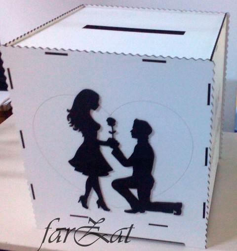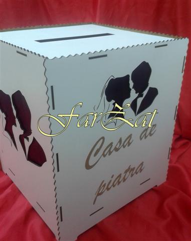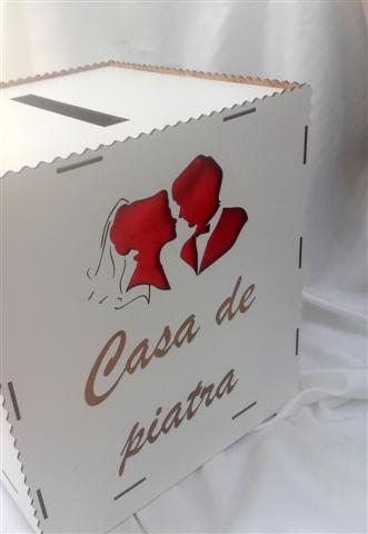 Cutii de dar nunta realizate din furnir cu dimensiunea de cca 30 x 30 x 30 cm. Cutia este alba si are in interior saten rosu sau mov. La categoria Casute de dar puteti vizualiza diferite modele de cutii realizate din lemn, saten, rafie sau din alte materiale, avand diferite dimensiuni, forme si culori, click aici. Pretul afisat este pentru o bucata.