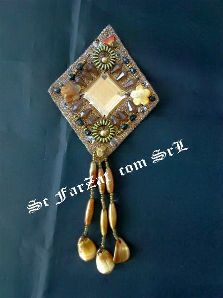 Epoletul are aplicat un model deosebit realizat din pietre de cusut, margelute si paiete. In mijloc se afla o piatra de cusut mare in forma de romb in care se reflecta lumina, iar in jurul ei sunt realizate diferite figurine. Dimensiuni epolet: 8 x 10 cm diagonalele. Epoletul se continua cu 3 randuri de ciucuri, pe care de asemenea se afla paiete si margelute. Lungimea ciucurilor este de cca 10 cm. Este un epolet realizat manual ce se poate coase pe orice tip de tesatura si este ideal pentru personalizarea obiectelor vestimentare. Se comercializeaza in seturi de cate 2 epolete. Cod: 21 Dimensiuni diagonale: 8×10 cm Lungime ciucuri: cca 10 cm Mod de realizare: Manual Culori disponibile: Aramiu Pretul afisat este pentru 1 set !!!