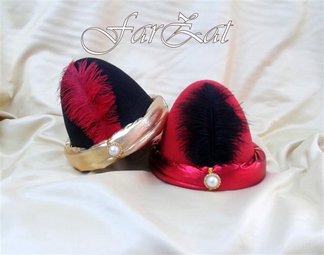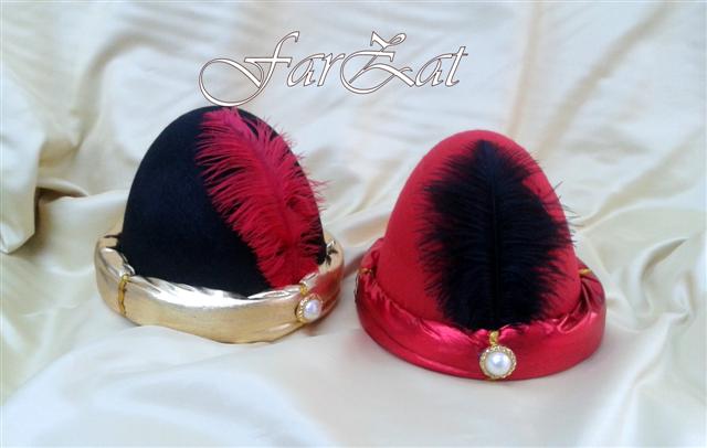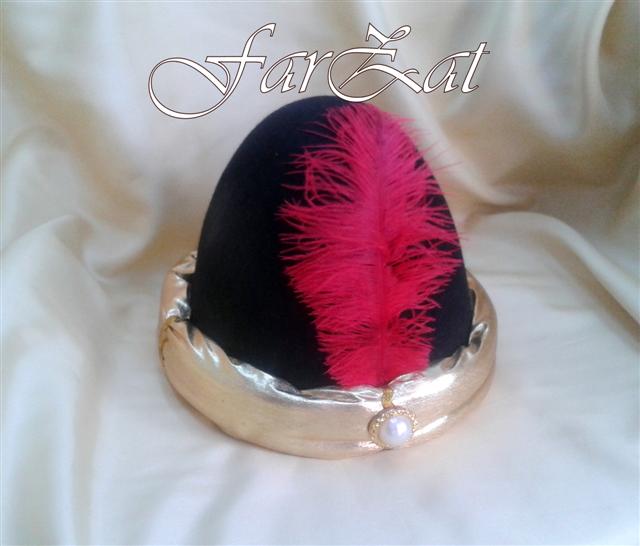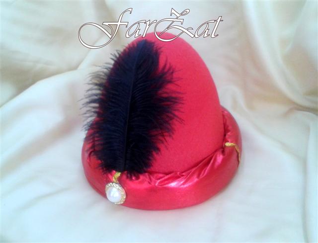 Fesul turcesc pentru petreceri tematice este de culoare rosu sau negru cu o pana de strut atasata in partea din fata.