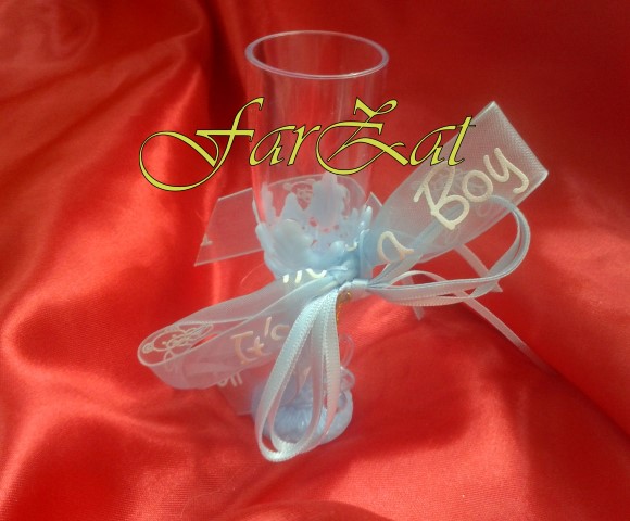 Paharul este realizat din material plastic transparent cu suportul bleu si este accesorizat cu o suzeta si cu fundite din saten si organza.