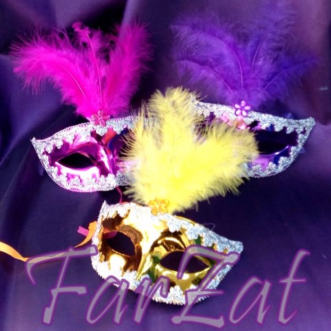 Masti realizate din material plastic accesorizate cu snur ornamental, pietre acrilice si pene naturale.