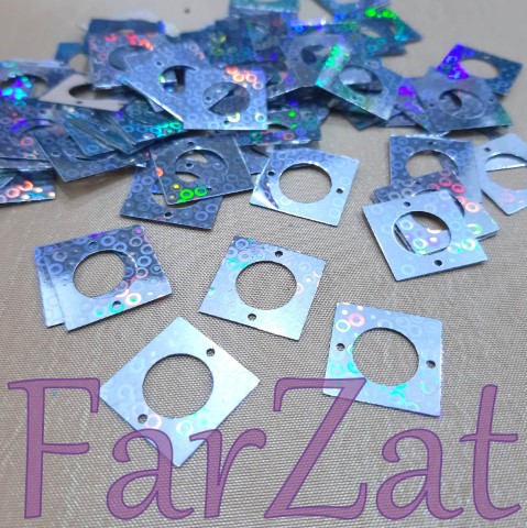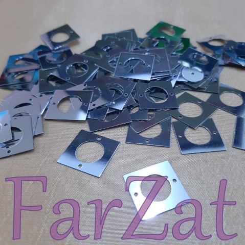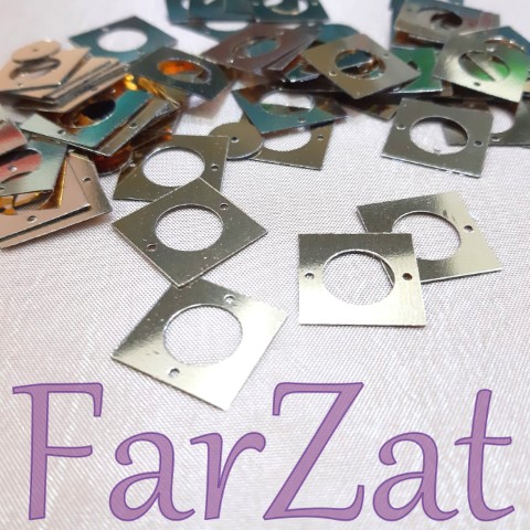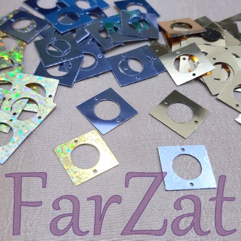Paiete de cusut cu forma patrata (latura de 16 mm), un cerc in mijloc (diametrul de 8 mm) cu doua gauri de prindere pe margine.